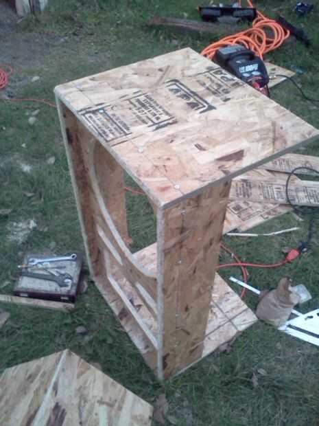Ahora se hace el corte y su tiempo para que se vea como algo parecido a una caja. Permite iniciar marcando una línea de tiza a través de los 4 lados de la caja en 2 3/8 pulgadas. (esta fue la medida que necesitaba para conseguir suficiente espacio para mi cuerno ser protegidos por el borde de la caja suya puede ser diferente) Esta línea será para perforar los agujeros en los lados para conectar a la parte delantera. Usé 4 tornillos de los lados cortos y 5 para los más. Use su discreción en cómo muchos usted quieren usar pero use una avellanadora y pegamento de madera en todos sus agujeros y costuras.