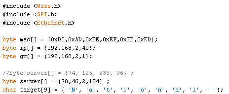 Si el sistema no puede obtener una dirección IP del servidor DHCP, se le asignará automáticamente una dirección IP fija. Al programar el Arduino, por favor actualice el siguiente para que coincida con tu red: