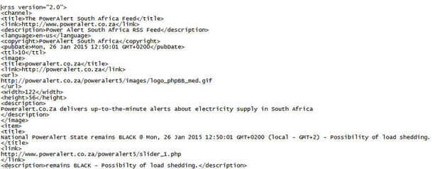 El sistema se conecta a la Página Web www.poweralert.co.za y lee el RSS feed http://poweralert.co.za/poweralert5/rss.xml.