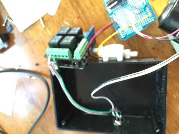 Con el Arduino atornillado ahora puede conectar el escudo de relé de Seeed Studio. Con el escudo de relé en su lugar, Conecte cables desde el conector o interruptor de activar/desactivar láser la fuente de alimentación al relé. El bosquejo actual te permite usar cualquiera de los 4 relés, pero se pueden también usar de J1 normalmente abierto y puntos comunes de conexión.