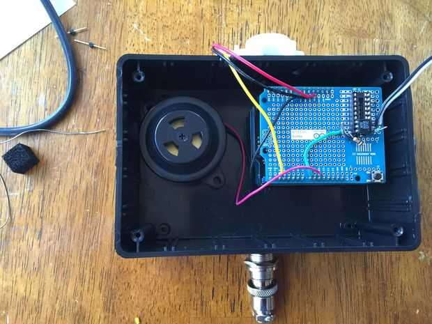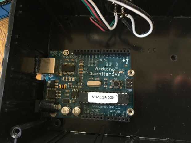 Usé un taladro a Marque y perfore agujeros para empernar el zumbador piezo a la base de la caja del proyecto. Luego hice lo mismo para el Arduino del perno en la base de la caja. Usé un cuchillo caliente cortar un agujero en el lado de la caja para puerto USB de la Arduino. Es importante recordar hacer localizar el Arduino para que el puerto USB es accesible desde el exterior!