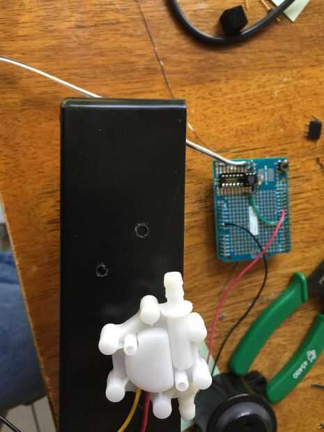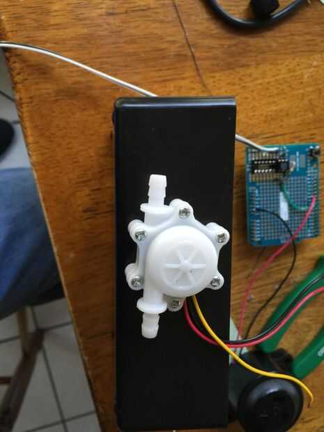 Luego perforé dos agujeros para que coincidan con los postes en la parte inferior del Sensor de flujo de agua. Aunque es posible fijar el sensor a la caja mediante tornillos, decidí hacer agujeros luchas apretados para los puestos y luego utiliza epoxi en ambos lados para fijarla a la superficie de la caja. Esto parece funcionar bien.