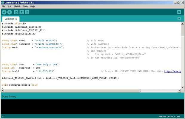 Una vez que usted hizo eso, descargue el código proporcionan aquí (archivoIlluminance.ino desde el archivo ZIP) y carga en el IDE de Arduino. Tienes que modificar algunas cosas en el código para que funcione