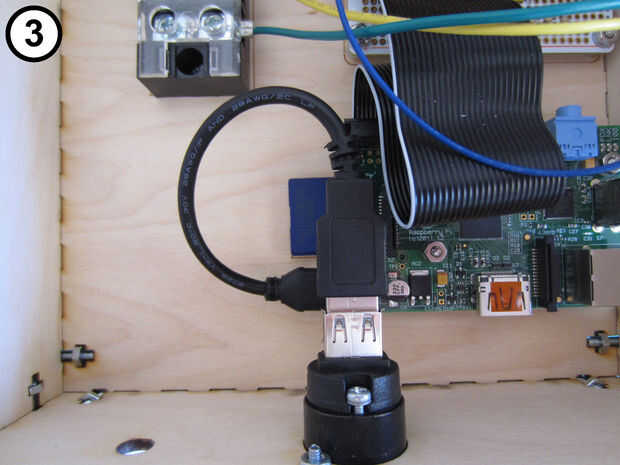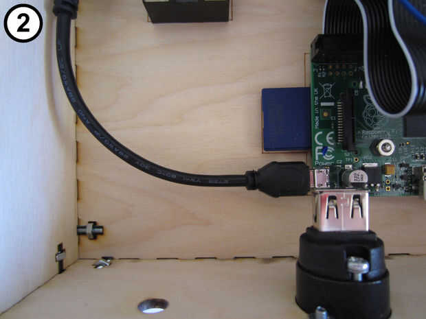 Conecte el micro conector macho tipo B del cable USB de 6"(Foto 1) a la frambuesa Pi (Foto 2).