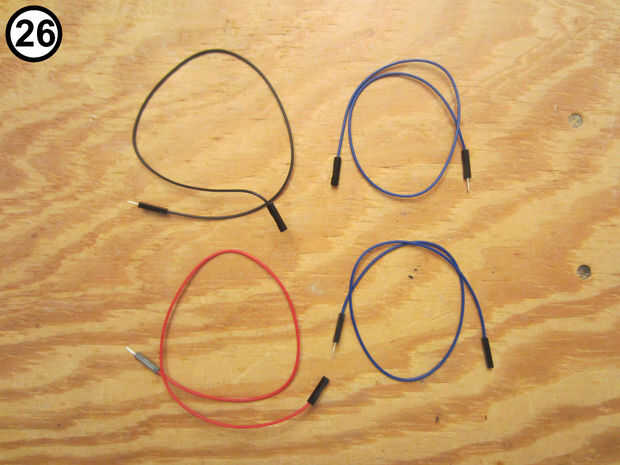 - 4 12" jumper cables (uno de los extremos macho, hembra de un extremo) (Sparkfun parte número PRT-09385) (foto 26)