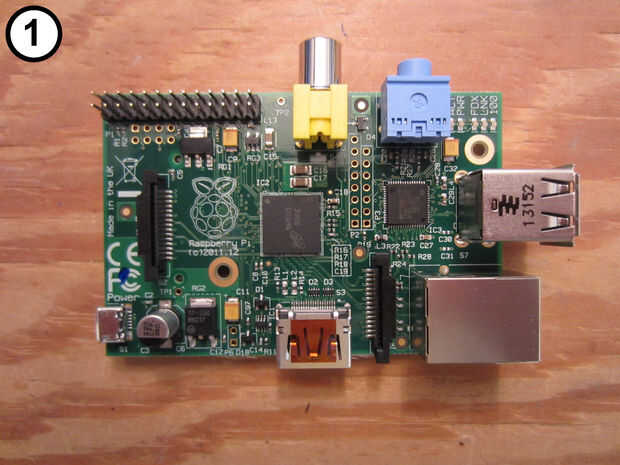 - 1 modelo de frambuesa Pi B 512MB de RAM (disponible en Amazon o Adafruit ID 998) (Foto 1)