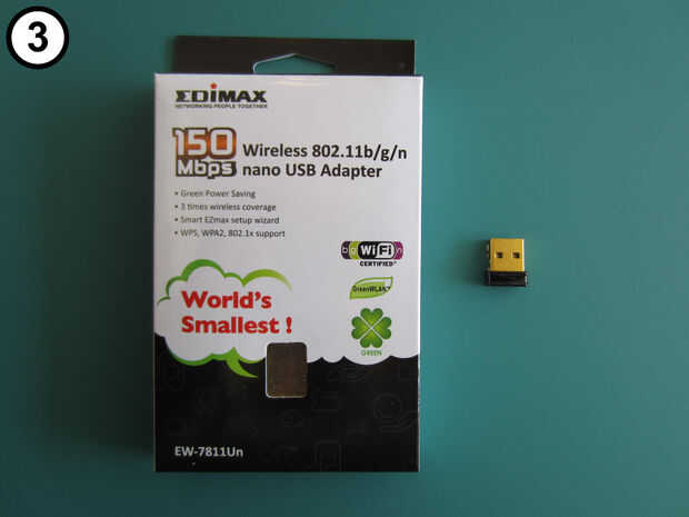 - 1 EDIMAX Wireless 802.11b/g/n nano USB adaptador (disponible en Amazon) u otro adaptador WiFi compatible para Raspberry Pi (Foto 3)