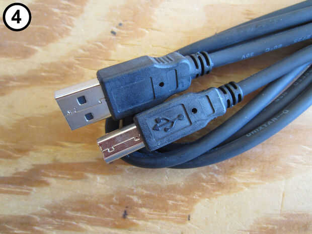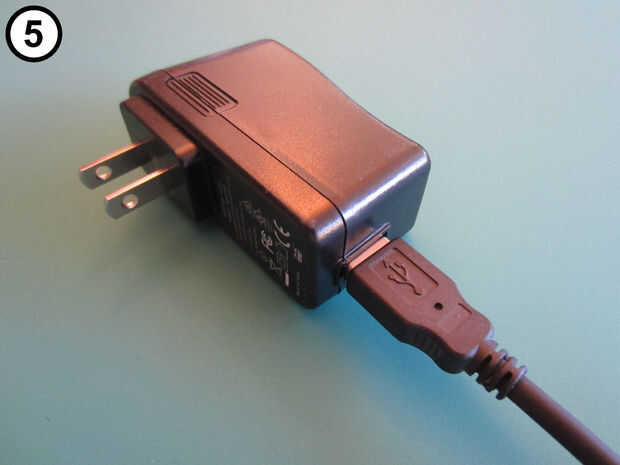 Enchufe macho tipo un extremo del cable USB (foto 4) en el conector en el adaptador de alimentación USB (Foto 5).