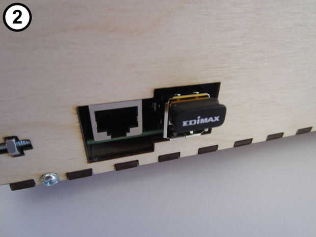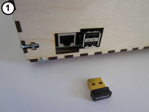 Conecte el adaptador USB WiFi en una de las ranuras USB de la Raspberry Pi (fotos 1 y 2).