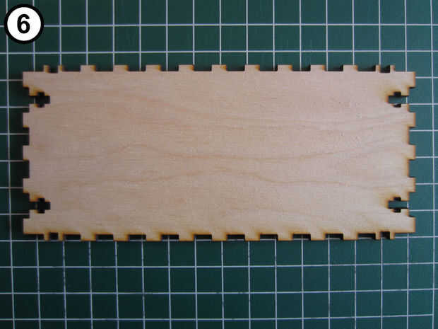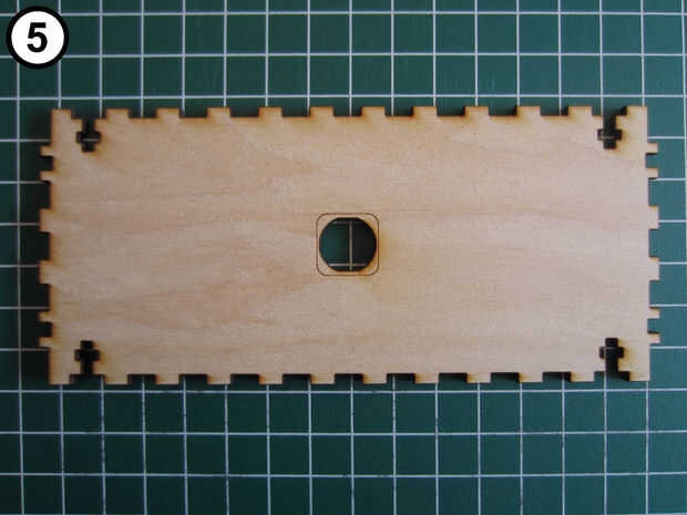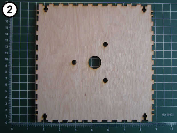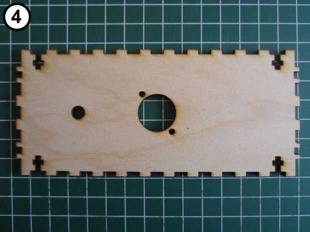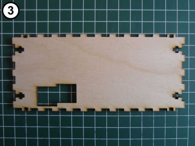 El primer paso es cortar las piezas para el caso de una hoja de contrachapado de abedul de 1/8"(3 mm). Un cortador del laser 45 vatios Epilog Helix en TechShop fue utilizado para cortar y grabar las partes. Todas las piezas del caso pueden recortar de una hoja de 16 "x 16" de madera contrachapada.