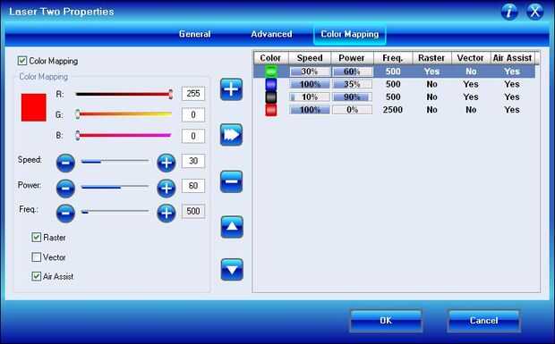 El diseño se muestra en el primer diagrama. Las líneas negras se cortará por el cortador del laser; las líneas azul se grabarse utilizando un ajuste de corte de baja potencia; texto verde será grabado; líneas rojas no se cortan, que son para mostrar el contorno de las piezas. Usé la capacidad de asignación de color de la cortadora del Laser para especificar la configuración de corte y grabado. La configuración utilizada se muestra en el lado derecho de la captura de pantalla "Color Mapping".