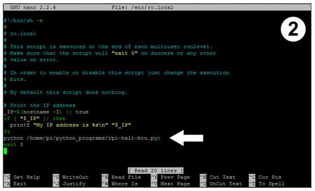 El cuarto paso es configurar el sistema para iniciar el programa de Python que controla y se ilumina el botón de apagado durante el proceso de arranque del sistema. Editar el archivo "/etc/rc.local" con el comando: