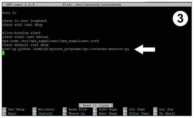 El quinto paso es configurar el sistema para ejecutar Python internet programa de monitoreo cuando el WiFi en la Raspberry Pi corriendo. Una vez que se ejecuta el programa de monitoreo de internet de Python, periódicamente pruebas de la conexión a internet y se iluminará la lámpara adecuada. El comando para iniciar el programa se coloca en el archivo "/ etc/network/interfaces". Editar el archivo con el comando: