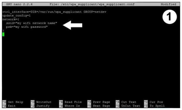 Agregue las líneas siguientes al final del archivo sustituyendo el nombre de su red inalámbrica y contraseña de su red inalámbrica, como se muestra y guarde el archivo. Si no está familiarizado con cómo utilizar el editor nano, howtogeek tiene una buena Guía para principiantes de Nano.