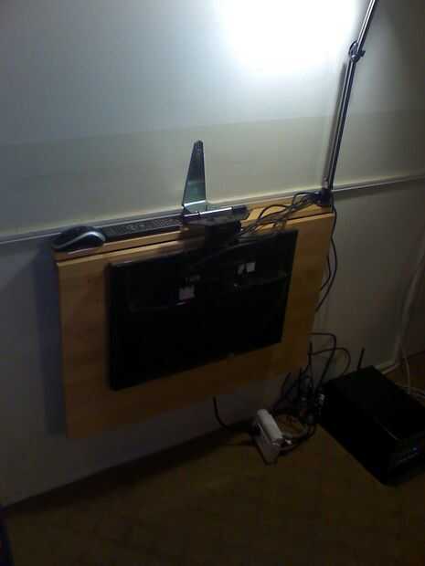 En mi habitación que tengo pero una pared que podría permitir que un escritorio pero esa pared está siendo utilizada por mi proyector. Todavía podía colocar un escritorio pero el monitor en el camino de la proyección y seguro como heck no quiero trastear con los cables y mueve de un monitor cada vez que quiero ver TV.