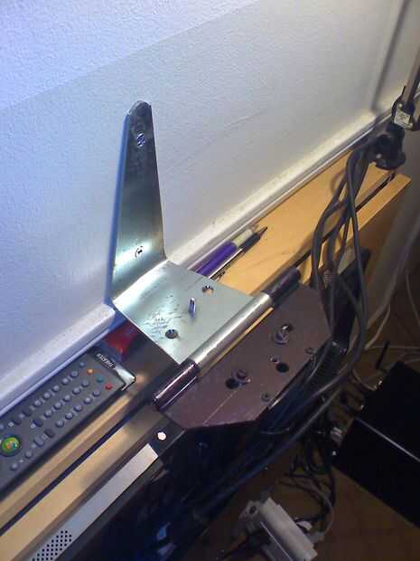 2. preparación de la bisagra para asegurar monitor: como pueden ver tuve que colocar 6 agujeros. 4 en la base de la bisagra para asegurar el monitor y 1 y 1 entre ambos brazos de la bisagra para una mariposa Tornillo que utilizo para ajustar la posición de un brazo en relación con el otro.