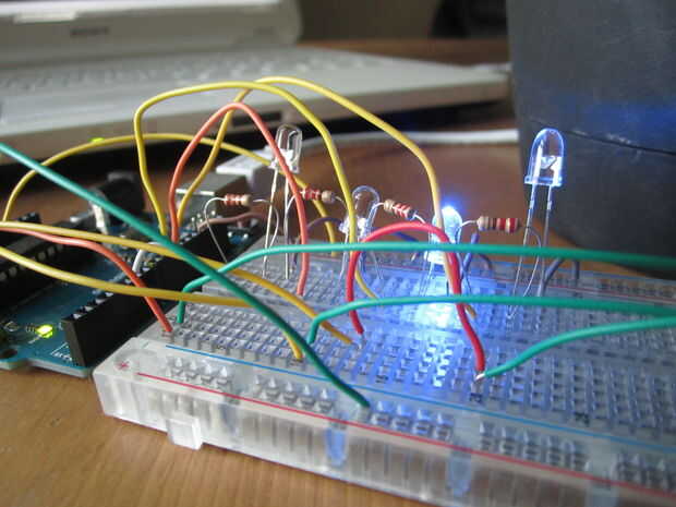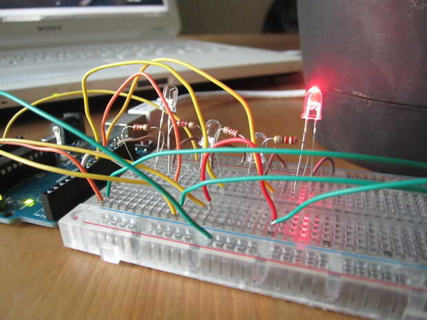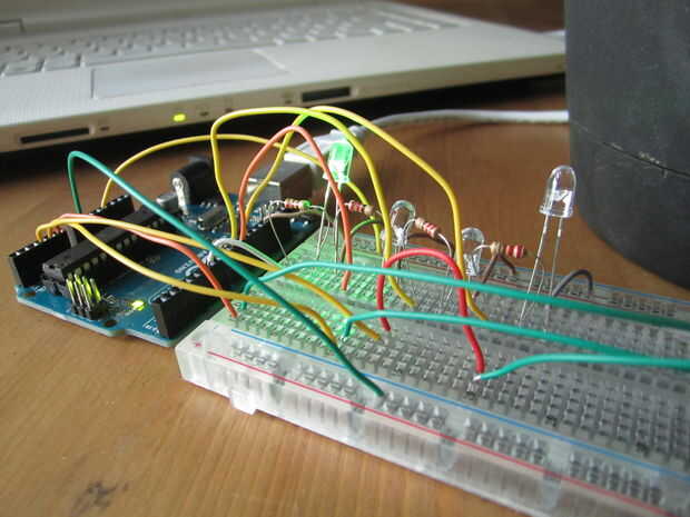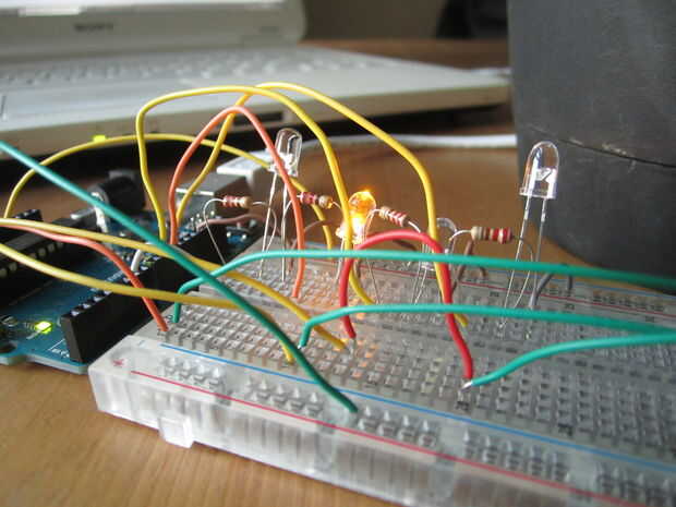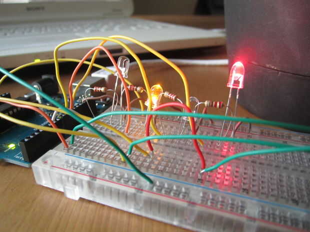 Si en cualquier momento uno de los sensores de lectura es una actividad anormal, la luz cambia de verde a color correspondiente. Pude usar 1 RGB led en su lugar, pero de esta manera puedo ver 2 o 3 problemas por separado al mismo tiempo. localizar exactamente lo que está mal...