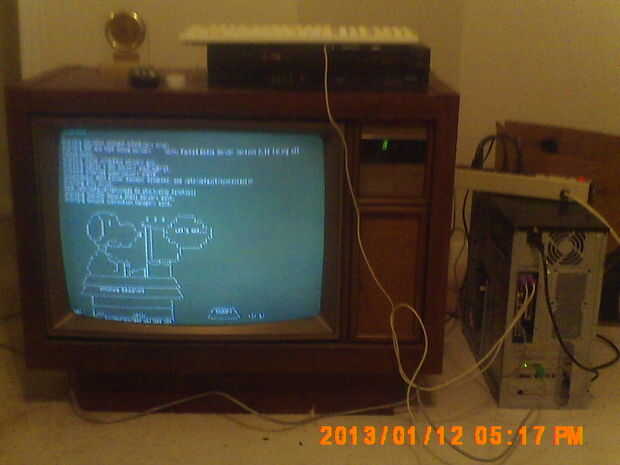 Con la ayuda de la vcr como un modulador de rf, conectado al ordenador para ver los resultados. No hay juegos de Gui, pero el modo texto y el texto funcionan bien. Olvidado de cuánto tiempo la televisión ha estado en la familia. Por lo menos tres décadas o más. Aún así le encanta ninvaders!