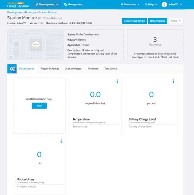 Primero se crea un prototipo. El mostrado arriba es mi prototipo de Monitor de la estación. Creado este pulsar tres veces el botón de agregar datos canal y creando tres canales de datos diferentes para mis tres entradas. Cuando usted está satisfecho que tienes todos los canales de datos, presione el botón crear dispositivo de prueba
