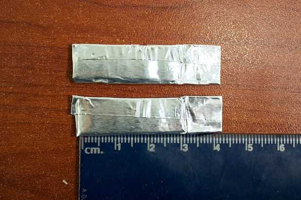 Cubra el cartón con un trozo de cinta de aluminio. Cortar el exceso, dejando una pestaña de pequeño (~ 1 cm x 1 cm) en el extremo.