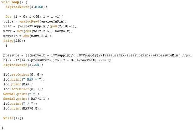 La presión aplicada (presión) se calcula usando la ecuación en la hoja de datos del transductor. Sin embargo, se utilizó un transductor diferencial, que significa la presión calculamos es realmente la diferencia entre los puertos 1 y 2. El mapa es la presión en el puerto 2 y se calcula restando la presión de la presión atmosférica es de 14.7 psi. Este valor se multiplica por 51.7 dar mapa en unidades de mmHg. Hay un término adicional en la ecuación para el mapa. Después de tomar varias medidas, notamos que una presión compensada que disminuye la tensión de aumento. Nos compensa esto restando "3.16/maxvolt" de la presión. Se obtuvo este valor promedio de la compensación de presión y relativos a la tensión medida. Una vez el se sale del bucle y mapa calculado, Pin 3 se escribe poco y la válvula libera el aire de la muñequera.
