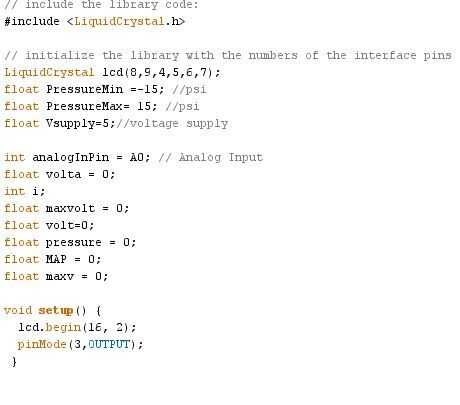 La primera imagen muestra el código utilizado para inicializar la biblioteca de LCD ("LiquidCrystal"), las dimensiones de pantalla LCD y todas las variables globales necesarias. Las dimensiones de la pantalla se inicializan en el programa de instalación y especifican el número de filas y columnas en la pantalla, 16 y 2 de nuestro código. La válvula de no soltar el aire cuando se aplica un voltaje a través de él, por lo que el Pin 3 (a la que está conectada la válvula) se inicializa en modo de salida y alta.