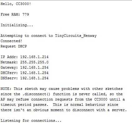 Después de cambiar esos pocos parámetros, cargar el programa y ver el puerto COM. Cuando todo ha sido configurado e inicializado, podremos leer la dirección IP, máscara de red, modo de puerta, servidor DHCP, servidor DNS y. La Junta también ser "Escuchar las conexiones..." con la dirección IP que se muestra, vaya a su navegador de preferencia y escriba ese número en la barra de direcciones. Después de ir a la dirección, deben pasar dos cosas. El navegador Web mostrará una página web, y le mostrará la ventana de COM que un cliente se ha conectado y lo que pide al cliente está haciendo.
