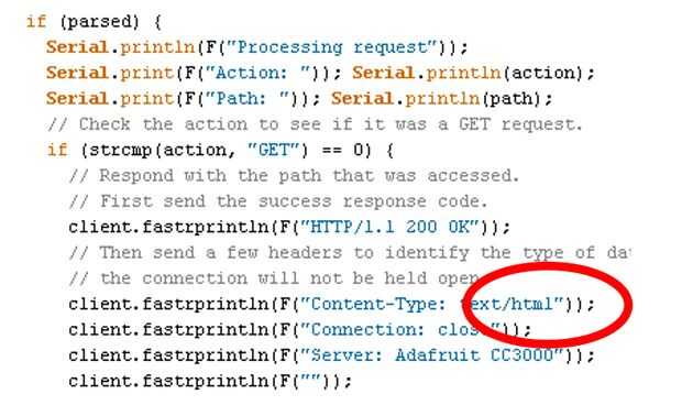 En la parte de configuración del código asignar pin 3 como una entrada y digital escriben alto. Así, cuando se cierra la puerta y el interruptor de láminas se completa el circuito, el pin 3 se en cortocircuito a tierra lo que es más fácil de leer. En el bucle principal se encuentra la línea de código dentro del "si (analiza)" sección que lee "client.fastrprintln (F (" tipo de contenido: texto/llano "));" cambio llano al html que se mostrará el contenido del cliente en formato html como una página web.