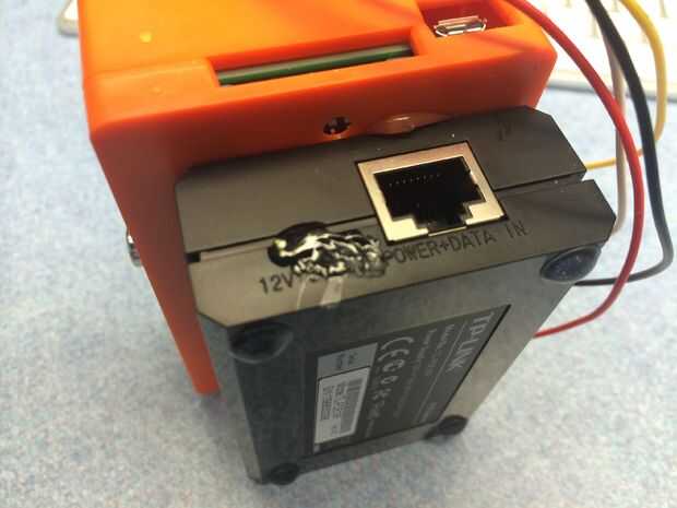 3) pegamento la inferior a la parte superior del adaptador PoE. Asegúrese de que el conector de "Salida de LAN" está en el mismo lado que el adaptador de Ethernet de Raspberry Pi.