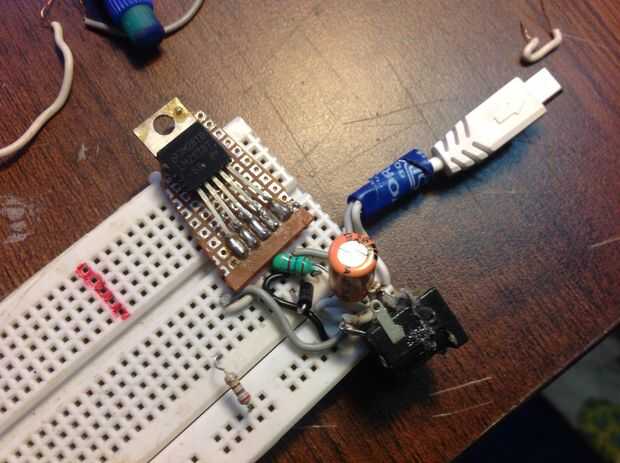 El miniUSB conecta con el Banco de energía para recargar. Por lo tanto, se conectará a la salida del circuito de cargador de LM2575 (5v). No te olvides de probar la salida con un multímetro primero!