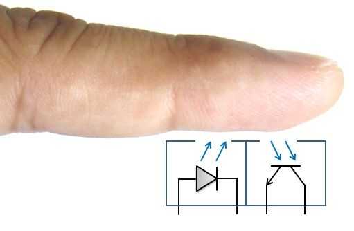 El Sensor de ritmo cardiaco tiene dos LEDs; un transmisor de IR (infra rojo) y un receptor de infrarrojos. El transmisor de infrarrojos emite luz infrarroja, que es reflejada por la sangre en el dedo. Esto refleja la luz IR es detectada por el receptor de infrarrojos.