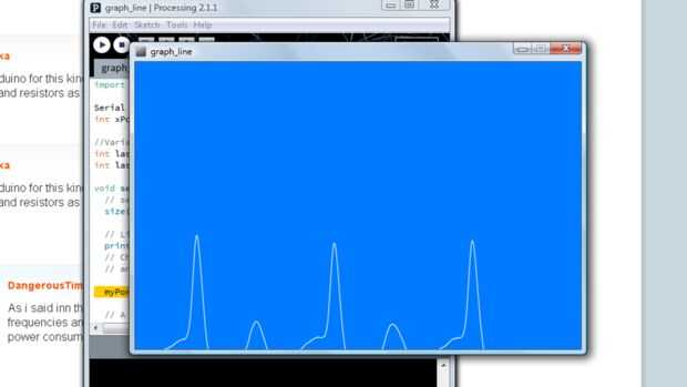 Obtendrá un gráfico de los valores de serie procedente de Arduino. En la gráfica, eje de X es el tiempo, el eje Y es el valor de la serie. Valor máximo del eje Y es de 1023 (en la parte superior del gráfico), y mínimo es 0 (en la parte inferior). Cuando no hay dedo se coloca obtendrá valores bastante arbitrarios, sino ubicarlo está dedo sin mover que crear un "Heart Beat" limpio en el gráfico, como se muestra en la foto de arriba.