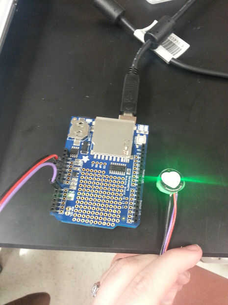 La placa Arduino Uno debe conectarse en su computadora, donde debe ha descargado el software de Arduino gratis desde http://www.arduino.cc/en/main/software . Enchufe en la ONU y asegúrese de que funciona. Después coloque con cuidado el protector de logger de datos encima de la ONU. Conecte el sensor del pulso para el escudo de logger de datos. El cable morado es su cable A0, el negro es tierra, y el rojo es + 5V. El sensor del pulso deberá encenderse en verde.