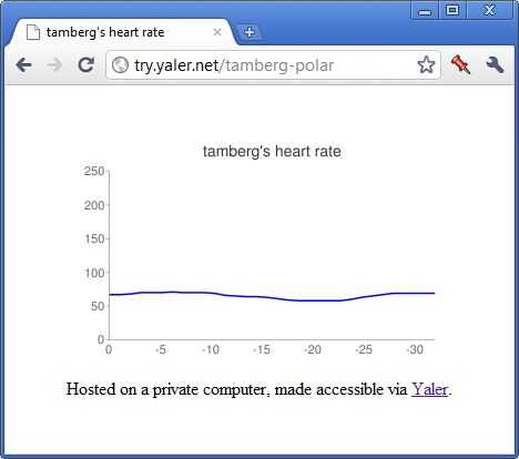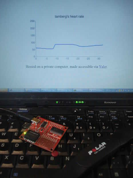 Utilizar un sensor de ritmo cardíaco Polar, un tablero barato hardware conectado vía USB y un poco de software para poner su ritmo cardiaco en el Web. Los datos vivos es servido desde su computadora y accesible a través del relé Yaler (revelación: soy uno de los fundadores de Yaler). Una vez apagado el servicio local, los datos ya no están públicos - propios tus datos!