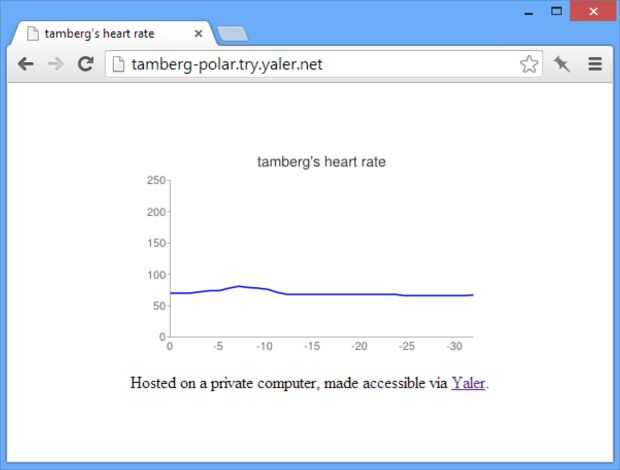 La interfaz de usuario de la Web PolarService ahora es accesible en una URL pública. Comprobar la salida de programa para ver tu URL personal de frecuencia cardíaca. Recargar la página para actualizar la gráfica de la frecuencia cardíaca. (Para activar la actualización automática HTML, quite el comentario de en el código fuente, volver a construir el exe y reiniciar el servicio).