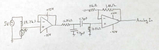 Arriba es una imagen del circuito. Contiene un divisor del voltaje de la fotorresistencia, un ADTL084 Op-Amp, un filtro paso bajo pasivo y un filtro pasivo.