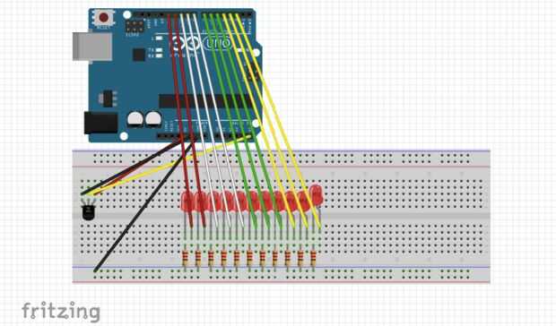 Empieza por conectar todos los resistores de 560 Ohm a un carril en el protoboard y el carril de tierra en el protoboard. Conectar el siguiente resistor un carril lejos (ejemplo: primera resistencia conectada al ferrocarril 1 el siguiente va a estar conectado a la varilla 3 y así sucesivamente...). A continuación conectar los LEDs para que la pata corta del LED está conectada en el mismo riel como el resistor y el pata larga a la derecha del carril vacío junto a él. Conectar todos los LEDs como esta. Por último Conecte un cable de puente en el riel con la pata larga del LED. Comience con el LED azul y conectarlo al pin digital 2 en el Arduino Uno.The a continuación es el primer LED verde. Conectar al pin digital 3 los LEDs deben ser en este orden: 1 LED azul, 8 LEDs verdes, LEDs.ahora rojo 2 Conecte el alambre de puente de 7.5 pulgadas para el carril de baja en el protoboard y el pin GND de Arduino.