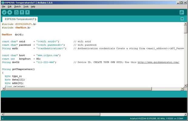 Una vez que usted hizo eso, descargue el código proporcionan aquí (archivoTemperature.ino desde el archivo ZIP) y carga en el IDE de Arduino. Tienes que modificar algunas cosas en el código para que funcione