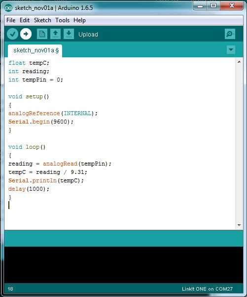 Antes de funcionamiento inalámbrico permite probar más de un monitor serie, esta prueba debe salida la temperatura sobre un monitor serial que puede sido usando un PC. El código se puede encontrar abajo abierto usando un IDE de Arduino con el plugin de LinkIt uno. Añadir el código en el puerto adecuado y abrir un monitor serie en que debe llegar la gama de lecturas en la pantalla que son la temperatura de la habitación que son.