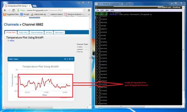 Los valores de temperatura se leen por BrickPi montada en un RaspberryPi que envía los datos en línea para trazar el gráfico.
