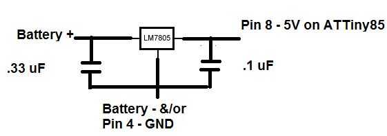 No mencionar antes que el ATTiny85 no tiene un puerto de Vcc que puede conectar una gran variedad de baterías y no hacer daño. La mayoría si no todos los productos de Arduino tiene un puerto de Vcc, por lo que se puede llegar con una gran variedad de fuentes de energía en los. No así con el ATTiny85. El ATTiny85 funciona mejor en exactamente 5 voltios. Por lo tanto, si haces el proyecto y el intento a funcionar con una batería de 9 voltios, no funcionará. Necesita un regulador de voltaje LM7805 barato para entregar exactamente 5 voltios al chip. Un par de salvedades: