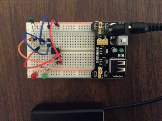 Que he proporcionado una foto y un esquema de la disposición del cableado. Mi sugerencia es usar un protoboard solderless con su propia fuente de alimentación de 5V. Si compraste el kit aludió a la lista de materias se puede utilizar un cable USB o con una batería de 9 voltios con un conector de barril. Esto proporciona un limpio 5V actual. El chip puede ejecutar directamente desde una batería de 9 voltios, pero está tomando las posibilidades con que sopla el chip.