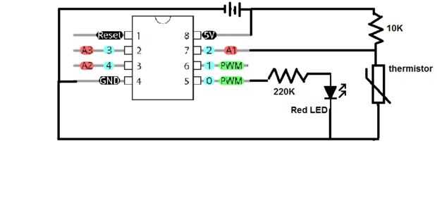 Conectar el resistor de 10K a la fuente de alimentación de 5 voltios y conecte el otro extremo para el termistor (sin polaridad, utilice cualquiera de los lados). Conecte un cable entre la resistencia y el termistor a pasador #7 ATTiny85. Esto también es conocido como A1 y es una de tres pernos análogos utilizados para el ingreso al chip. Su bosquejo se referirá al pin como A1. Conecte el extremo abierto en el termistor a GND. A continuación, conecte una resistencia de 220 Ohm al pin #5 y el otro extremo a la positivo (largo) del LED rojo. Pin #5 corresponde a un puerto de salida digital, conocido por su dibujo como pin 0 (cero), uno de los dos pines PWM. El plazo de ejecución corto del LED va a GND.