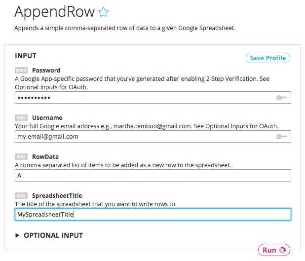 Llene los campos de entrada utilizando la información de tu cuenta de Google y el título de la hoja de cálculo que está utilizando. Por ahora, vamos a codificar los valores que se añade a la hoja de cálculo; posteriormente ajustaremos este modo que los valores se agregan viene desde el potenciómetro que se acople a tu LaunchPad. Puesto que sólo estamos registrando los datos en una columna de la hoja de cálculo ("flujo de agua"), sólo podemos poner un solo carácter en el campo de entrada de RowData como marcador de posición.