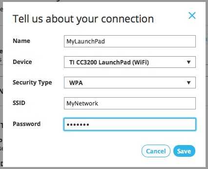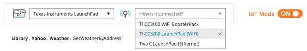Una vez esté configurado, inicie sesión Temboo e ir a la Google > hojas de cálculo > AppendRow coreo en la biblioteca Temboo. Activar Modo de IoT y seleccione "Texas Instruments LaunchPad" y "CC3200 TI LaunchPad (WiFi)" en el menú desplegable. En la ventana emergente que aparece, asigne un nombre a la placa (de modo que puede encontrarlo otra vez para futuros proyectos) y también rellenar su información de red inalámbrica (esto permitirá Temboo generar el código que está preconfigurado para funcionar con la red).