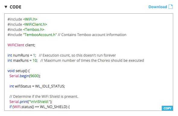 Ahora que has probado la coreo con éxito, usted puede desplazarse hacia abajo un poco más para encontrar la sección de código de la página. Cuando estás en modo de IoT y ejecuta una coreo, Temboo genera automáticamente código que puede utilizar para hacer la misma llamada de API desde el LaunchPad. Copie el código y pegarlo en un nuevo dibujo en el IDE de Energia.
