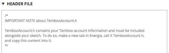 Para poder ejecutar este boceto en el LaunchPad, debe configurarse con un archivo de encabezado TembooAccount.h adecuado que contiene la información de su cuenta de Temboo. Para crear el archivo de encabezado, hacer una nueva pestaña en Energia y asígnele el nombre TembooAccount.h.