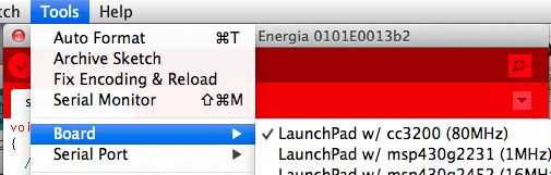Finalmente, asegúrese de que la placa está lista para ir yendo a la Herramientas > tablero en Energia y la selección de la plataforma se trabaja con menú. Luego, ir a la Herramientas > Serial Port menú y seleccione el puerto de la placa está conectada a.