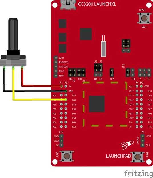 A continuación, vamos a conectar el potenciómetro. Debe tener tres cables: los conductores exteriores deben conectarse a los 3,3 v Fuente de alimentación en el LaunchPad y a tierra (no importa qué lado va a cual), y el uno en el centro debe conectarse a la clavija que va leyendo de (recordemos que anteriormente seleccionamos el perno con la etiqueta "P60"). Puede hacer referencia al esquema de ayuda. Coloque el potenciómetro en el interior de la manija de la llave para que gire los dos juntos.