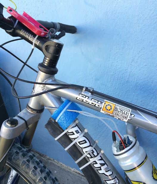 Retire la tapa de la botella de agua y coloque el Arduino con la pila de 9V y sensor de velocidad del aire en su interior. Puede introducir otra pieza de espuma (o dos) dentro de la botella primero, para que las cosas no se mueven en exceso. Entonces ponga el agua en la jaula de la botella y con cuidado, inserte el tubo de Pitot tubo a través de la espuma lo que es paralelo al suelo; Asegúrese de que el frente de la misma enfrenta hacia adelante y no esté bloqueado por cualquier cable u otras piezas de tu moto. Asegúrese de que los orificios laterales del tubo de Pitot no están cubiertos por la espuma.